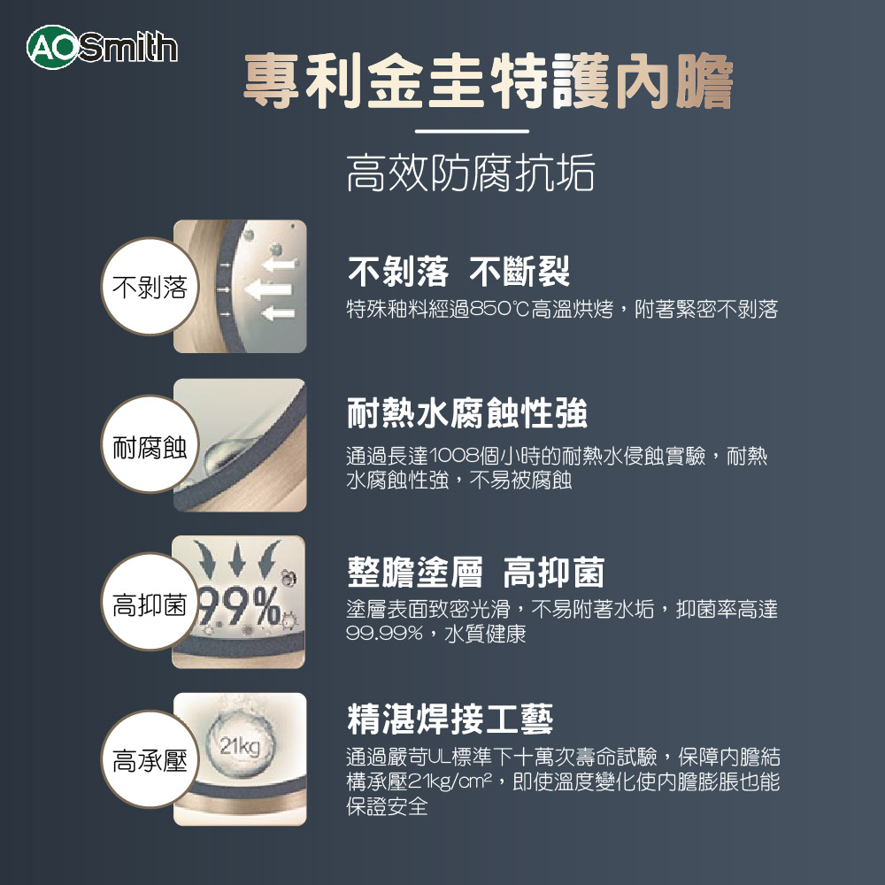 | 3. | 每批熱水器內膽都通過21kg/cm² 承壓實驗。 |